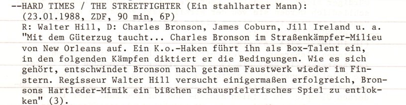 Im Jahr 1989 war es mir noch vergleichsweise wurscht, welches Standing ein Regisseur gerade hatte, von Alfred Hitchcock und einigen anderen Größen abgesehen und so kam auch für Walter Hills allgemein respektiertes Langspielfilm-Debüt von 1975 nur eine eher durchschnittliche Wertung heraus, obwohl er längst mit Filmen wie „Nur 48 Stunden“ oder „Red Heat“ zu den führenden Cop-Thriller-Machern aufgestiegen war. Der Film erhält gegenwärtig von den Nutzer:innen der IMDb eine Durchschnittswertung von 7,3/10. Aber gerade die 1970er stehen in meiner heutigen Betrachtung um einiges besser da, als das wenige Jahre nach ihrem Ende der Fall war.