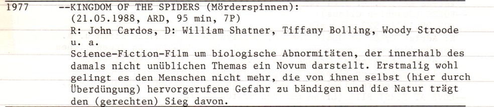 Gemäß meinem heutigen Kenntnisstand war „Mörderspinnen“ nicht der erste Film, in dem die Menschheit nicht mehr siegt, sondern reiht sich in den „kritischen SF“ der 1970er Jahre ein, der 1968 mit „2001“ begann.