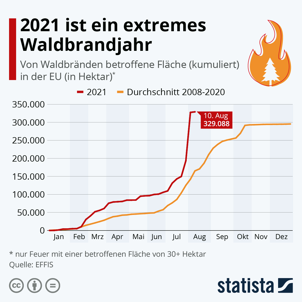 2021 ist ein extremes Waldbrandjahr für Europa. Das betrifft innerhalb der EU vor allem den Süden des Kontinents. In Griechenland ist die bei größeren Waldbränden (ab 30 Hektar) verbrannte Fläche bereits sieben Mal so groß wie im Gesamtjahr 2020. In Italien verzeichnet das European Forest Fire Information System (EFFIS) ein Plus von rund 93 Prozent. Wie stark die Feuer wüten, zeigt auch der in der Statista-Grafik abgebildete Vergleich. Sind im laufenden Jahr bei Großfeuern bereits 329.088 Hektar ein Raub der Flammen geworden, waren es im Schnitt der Jahre 2008 bis 2020 rund 295.000 Hektar in zwölf Monaten. In Deutschland ist die Lage bisher indes ruhig. Die EFFIS-Statistik verzeichnet bisher drei größere Waldbrände mit 121 Hektar verbrannter Fläche.