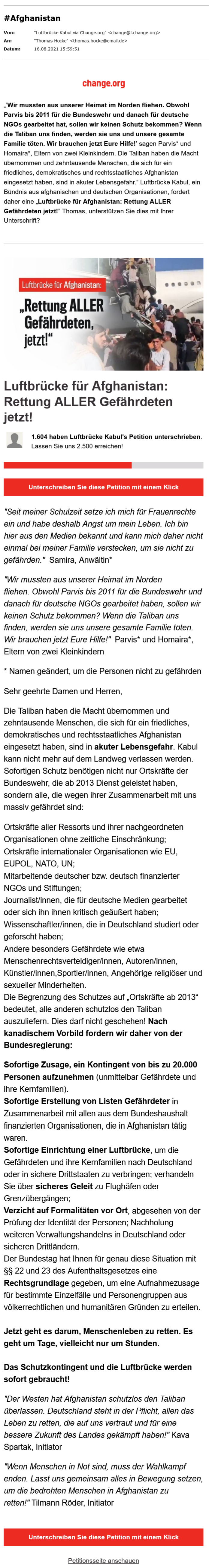 wir müssen uns dafür entschuldigen, dass wir diese Petition erst jetzt weiterleiten, sie erreichte uns vor etwa 24 Stunden. Inzwischen ist die Luftbrücke aus Afghanistan erstellt und wir hoffen, dass so viele Menschen wie möglich von der Bundeswehr und anderen Streitkräften in Sicherheit gebracht werden können. Doch es geht um mehr. Es geht um eine sichere Zukunft für diese Menschen.