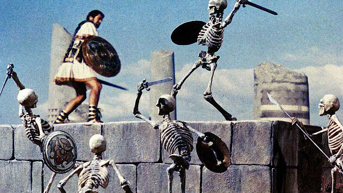 Alle diese Filme sind klassische Heldenreisen, auf „Jason und die Argonauten“ trifft das sogar in besonderen Maße zu, weil die Argonauten-Sage zu den Werken gehört, die das Genre, zu dem auch Odysseus‘ Abenteuer zählen, erst geformt haben. Die Sache sieht immer so aus, dass ein Häuflein wackerer Männer gegen übermächtige Titanen, Ungeheuer, Harpyien, Wesen aus Pappmaché aller Art, wenn es sich um einen Harryhausen-Film handelt, zu kämpfen haben. Apropos: Die Skelett-Kampfszene gehört wirklich zu seinen besten, das muss man dem Film schon lassen. Die Bewegungen sind weitaus flüssiger und quirliger als bei den meisten anderen dieser Animationen.