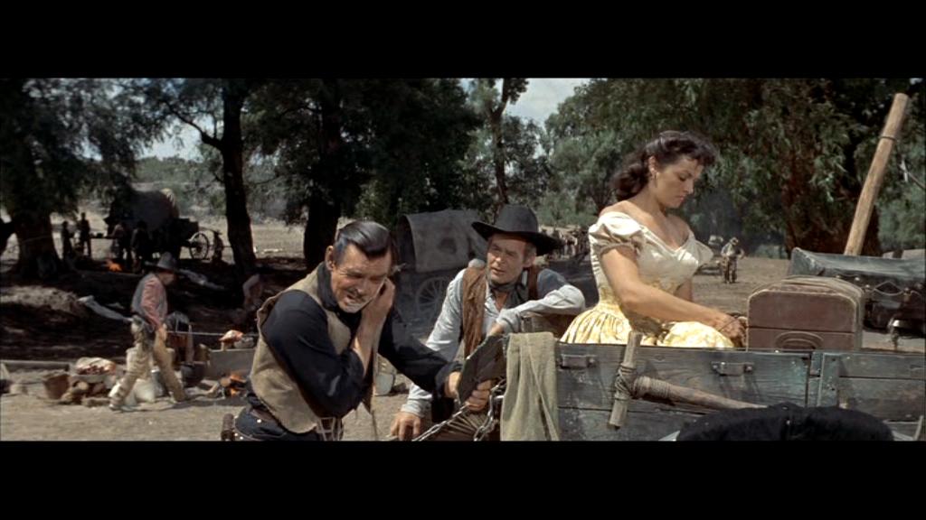 Zwei Drittel des Films waren wohl vorüber, bis mein Déjavu kam. Ich hatte von Beginn an überlegt, ob es sich hier um den Western handelt, von dem ich zumindest einmal Ausschnitte gesehen hatte und der mir als sehr kleinräumig und studiohaft in Erinnerung war. Ja, es muss „Drei Rivalen“ gewesen sein, es handelte sich um die Szene, in der Jane Russell im Planwagen sitzt, Spottverse auf Clark Gable singt und dieser irgendwie nicht von seinem Platz wegkommt. Vermutlich kam mir das Setting so eng vor, weil er doch die ganze, weite Prärie gehabt hätte, um auszuweichen.