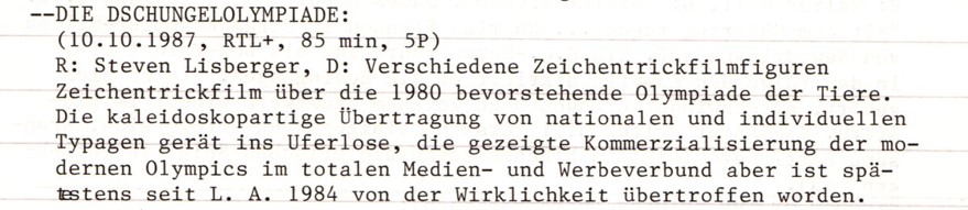Die IMDb-Nutzer:innen können heute etwas mehr mit dem Film anfangen als ich seinerzeit, der Durchschnitt liegt aktuell bei 6,8/10. Die Realität sah damals so aus, dass einige westliche Länder die Olympischen Spiele in Moskau im Jahr 1980 boykottierten, wegen des Einmarschs der Sowjetunion in Afghanistan. Die Retoure kam bei den oben erwähnten 1984er Spielen in Los Angeles. Offenbar werden in dem Film Winter- und Sommersportarten gleichermaßen gezeigt. Da in „Animalympics“ die Sportreporter:innen eine wichtige Rolle zu spielen scheinen: Bei den Sommerspielen war Westdeutschland ja nicht dabei, aber an die Winterspiele in Lake Placid habe ich eine überdurchschnittlich gute Erinnerung, weil ich versucht habe, Fernsehreportagen auf Audiokassetten aufzuzeichnen. Symptomatisch für jene Spiele ohne eine einzige Goldmedaille für die BRD eine der legendärsten Sportreportagen aller Zeiten, sie stammt von Bruno Moravetz, der den 15-Kilometer-Skilanglauf der Männer kommentierte : „Wo ist Behle?“.