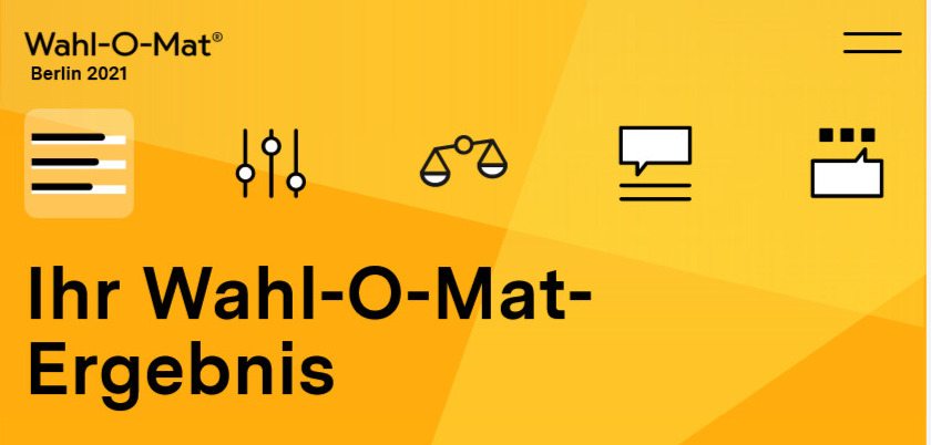 Vorgestern erschien der Wahl-O-Mat für die Berliner Abgeordnetenhauswahl 2021. Heute ist mal etwas Zeit zum Beantworten gewesen. Ehrlich geschrieben, wer sich orientieren möchte, findet keine schnellere Übersicht, die auch besser ist. Sicher gibt es Priorisierungen und Themen, die nicht jedem wichtig sind, andere, die jemand vermisst. Aber unter den 38 Fragen sollte doch einiges sein, was einen Anhalt dafür gibt, welche Parteien man bevorzugen könnte, wenn es tatsächlich darum geht, die eigenen politischen Ansichten einigermaßen abzubilden.