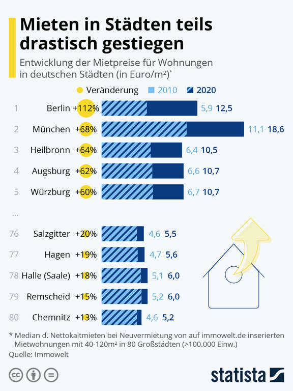 Sie haben es vielleicht schon gelesen, weil derzeit mehrere ähnliche Grafiken im Umlauf sind. Berlin ist die Stadt, in der im Turbo-Tempo gentrifziert wird. Die Angebotsmieten stiegen gemäß dieser Grafik von Statista innerhalb von nur elf Jahren um 112 Prozent, schneller als in jeder anderen deutschen Großstadt.