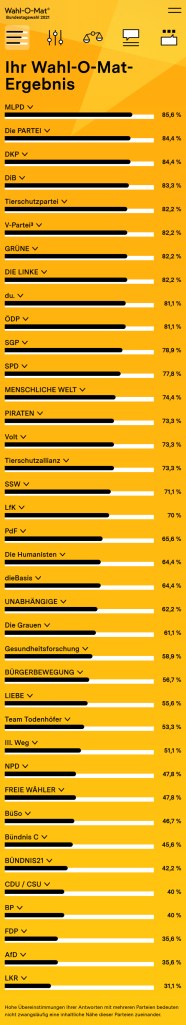 Nach dem Wahl-O-Mat für die Abgeordnetenhauswahlen von Berlin haben wir jetzt also den Wahl-O-Mat-Check für die Bundestagswahl am selben Tag gemacht. Wir müssen ja als Berliner bei all diesen Wahlen an die Urne, da hilft nichts. Und da ist es gut, das eigene Mindset zu überprüfen.