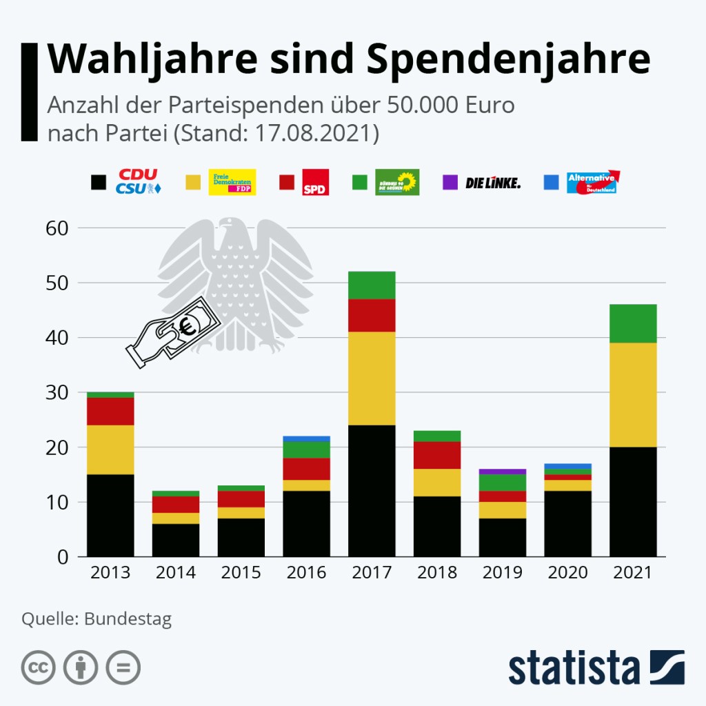 - Die Zahl der Großspenden wird in diesem Jahr auf jeden Fall einen Rekordstand erreichen. Bereits am 17. August haben sie fast die Höhe des gesamten Wahljahres 2017 erreicht, die bisherige Höchstmarke.