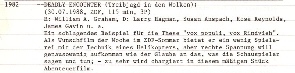 Die IMDb-Nutzer:innen geben immerhin 5,8/10, also fast das Doppelte wie ich damals. Ich bin ganz froh, dass ich das seinerzeitige und neuere Actionkino erst jetzt richtig aufarbeite, mit einer gewissen Gelassenheit gegenüber seinen Flachheiten und Unsinnigkeiten. Mehr kann ich nachträglich nicht zu „Deadly Encounter“ schreiben, weil ich an diese einzige Sichtung des Films im Jahr 1988 keine Erinnerung mehr habe. Eine hintergründige Interpretation meiner sehr schlechten Bewertung könnte sein, dass es mir schon reichte, dass Larry Hagman der einzige Typ war, der es schaffte, meine Mutter mitten in der Woche vor den Fernseher zu kriegen, mit der damaligen Hit-Serie „Dallas“ natürlich.