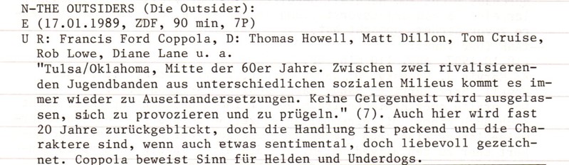 „Outsider“ entstand im selben Jahr, wird aber aufgrund seines späteren Premierendatums zu den 1983er Produktionen gerechnet. Wenn Francis Ford Coppola einen Film macht, egal worüber, muss er wohl gut sein. Heute wird er von den IMDb-Nutzer:innen mit 7,1/10 gut, aber nicht herausragend rezipiert. Interessanterweise exakt die gleiche Bewertung wie „American Diner“. Es gibt noch eine Übereinstimmung: Viele der jungen Darsteller:innen in beiden Filmen wurden später Stars, „The Outsiders“ betreffend allen voran Tom Cruise.