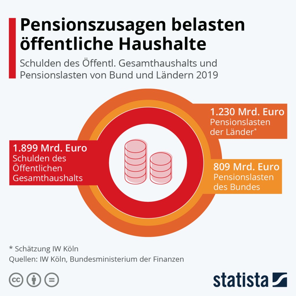 Nun hat Statista heute eine Grafik erstellt, die noch einmal eine andere Perspektive eröffnet: Der Blick auf die Pensionszusagen des Bundes und der Länder für die Beamten erweitert den Blick erheblich. Es wird so viel über die Rentenkasse diskutiert, aber kaum über diese Pensionszusagen, die den Schuldenstand glatt verdoppeln. Sicher, implizite Schulden sind keine expliziten, genauso könnte man hinzurechnen, was die Rentenkasse in den nächsten Jahrzehnten zu leisten hat. Dass diese Schulden jedoch dermaßen hoch sind, obwohl Deutschland einen der in Relation zu den Erwerbspersonen kleinsten öffentlichen Dienste der westlichen Welt hat, ist ein Punkt, über den wir reden sollten. Zunächst aber die Grafik, dann der Begleittext von Statista: