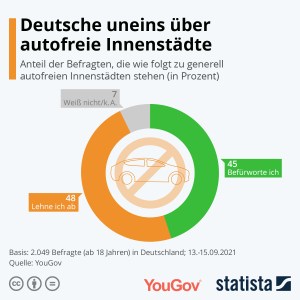 Wie unsere Grafik zeigt, befürworten 45 Prozent der Teilnehmer:innen an einer gemeinsamen Umfrage von Statista und YouGov autofreie Innenstädte, 48 Prozent sind dagegen. Auch entlang der Geschlechtergrenzen sind die Pro- und Kontra-Stimmen gleichmäßig verteilt. Immerhin haben die meisten Befragten eine Meinung zum Thema: Nur sieben Prozent konnten sich nicht für Für oder Wider entscheiden.