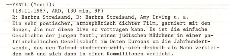„Yentl“ war also ein kompletter Autorenfilm, nach Informationen aus der Wikipedia, die ich in den 1980ern natürlich noch nicht zur Verfügung hatte. Aktuell erhält der Film von den Nutzer:innen der IMDb nur einen Score von 6,6/10, auch der Metascore liegt mit 68/100 in einem ähnlichen „mittelplusguten“ Bereich, deswegen wäre es sicher ratsam, eine Neusichtung vorzunehmen, bevor ich Mutmaßungen anstelle, ob die herausragenden 9/10 erhalten blieben, die ich damals vergeben hatte. Einstweilen bleibt es bei dieser Bewertung.