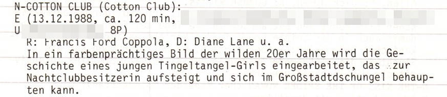 „Cotton Club“ war ein kommerzieller Misserfolg. Angeschaut hatte ich ihn erstmals im Rahmen eines ersten Re-Release vier Jahre nach dem eigentlichen Kinostart und die lange Verpixelung resultiert daraus, dass ich ihh mit mehreren Personen zusammnen im Kino genossen habe, die am Beginn einem wichtigen neuen Abschnitt meines Lebens eine Rolle spielten. Geprägt ist meine heutige Sicht auf den Film aber von einer späteren Fernsehausstrahlung, zu der es eine längere Rezension geben wird (als Filmfest 618.1). Die IMDb-Nutzer:innen vergeben gegenwärtig für den Film nur durchschnittlich 6,5/10. Das halte ich für zu wenig und beziehe mich dabei nicht auf die besondere Situation Ende 1988, sondern auf die Alleinsichtung im Fernsehen. Dummerweise wird F. F. Coppola immer an „Der Pate“ und „Apocalypse Now“ gemessen, aber einzig bei Letzterem kann ich das weitgehend nachvollziehen, während ich „Der Pate“ und „Der Pate II“, die auf den Plätzen 2 u nd 3 der aktuellen IMDb Top 250 stehen, nicht so sehr technisch, aber bezüglich des Gesamtkonzepts für (leicht) überbewertet halte. Dabei spielt die Tendenz, die Mafia zu glorifizieren, eine Rolle. Eine solche Romantisierung des Gangstertums an sich zeigt „Cotton Club“ z. B. weitaus weniger, obwohl er als Musikfilm-Gangsterfilm eine gewagte Kombination ist, zumindest für die 1980er und ein wenig an Werke aus der klassischen Hollywood-Ära wie „The Roaring Twenties“ (1939) erinnert, der ebenfalls schon einen Blick zurück wirft. Außerdem ist der Cotton Club historisch, in ihm sind Größen wie Duke Ellington und Cab Calloway aufgetreten.