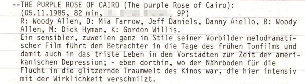Anlässlich der kürzlich auf dem Filmfest(ival) vorgestellten Kurzrezension zu „Broadway Danny Rose„, der ein Jahr zuvor entstanden war, schrieben wir, dass unsere Vorstellung vom Filmschaffen Woody Allens zu jener Zeit eher von „The Purple Rose of Cairo“ geprägt ist und er sieht das wohl auch so: Dieser besondere Film ist einer seiner Lieblinge.