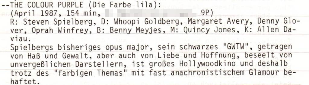 Es könnte aber auch sein, dass sich das Lila gleichermaßen mit etwas verbindet, das in der Romanvorlage weitaus stärker hervortritt, aber in dem ohnehin schwierigen Film 1985 noch nicht in voller Breite ausgespielt werden konnte: Lesbische Liebe, dazu zwischen zwei Afroamerikanerinnen, die beide auf dem gewählten Titelbild zu sehen sind. Vielleicht also nicht des Soundings wegen, obwohl wir es schöner gefunden hätten. Ein afroamerikanisches Kino gab es in den 1980ern noch nicht, also nahmen sich Weiße der Rassenfrage an und meinten es sicher besser als wenige Jahrzehnte zuvor, indem sie People of Color in den Mittelpunkt rückten und überwiegend positiv darstellten. Das Publikum mag den Film immer noch und schenkt ihm 7,8/10. Whoopi Goldberg wurde durch dieses Werk zu einem der Stars der folgenden 1990er. Was mich wundert: Dass „Die Farbe lila“ nie in der IMDb-Top-250-Liste vertreten war. Das lässt darauf schließen, dass sich seine Rezeption im Lauf der Jahre eher verbessert, zumindest aber nicht verschlechtert hat. Eine neuere Sichtung des Films liegt vor und damit vermutlich auch ein Rezensionsentwurf, den wir als „Filmfest 641.1“ nachreichen werden. 90/100 würden es wohl nicht mehr werden, aber sicher über 80/100. Diese großen Filme ihrer Zeit im Kino mit entsprechender Begleitung anzuschauen, hatte etwas Magisches, das die Bewertungen nicht selten nach oben drückte und selbstverständlich suchten wir uns die Filme entsprechend aus.