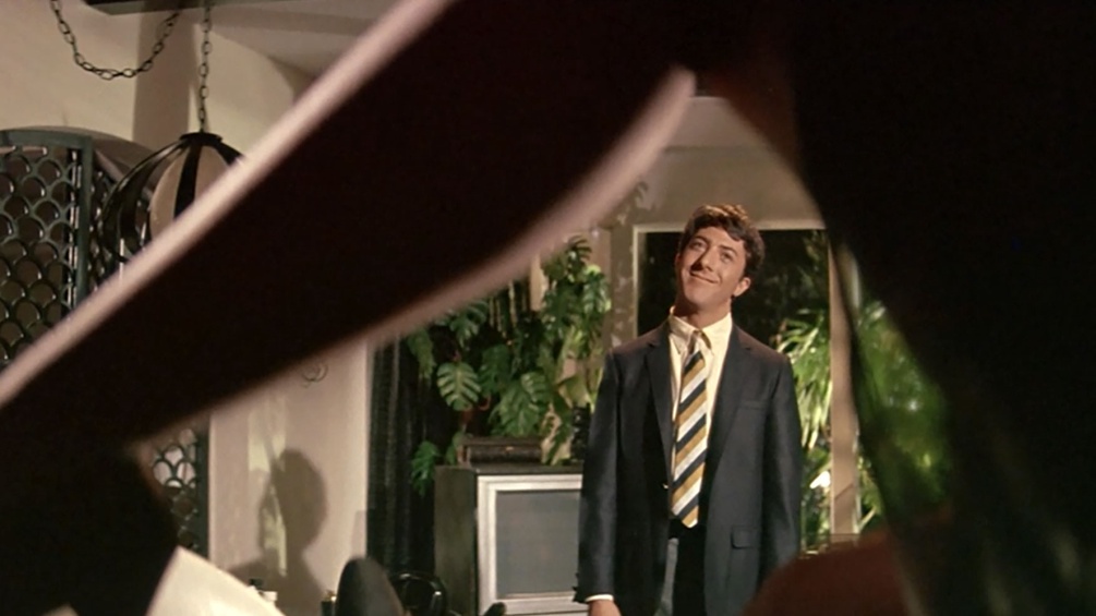 Roger Ebert hat in seiner ersten Kritik zu „Die Reifeprüfung“ auf die Verwandtschaft bzw. Sukzession des Film auf die britischen Komödien der Jahre zuvor hingewiesen, und das ist in der Tat ein wichtiger Aspekt. Wenn nämlich „Die Reifeprüfung“ Vorläufer hatte, dann nicht in der klassischen US-Komödie, sondern in Filmen wie „Tom Jones“, die in den Swinging Sixties entstanden, als in Europa Konventionen aufgebrochen wurden, während Hollywood noch darüber rätselte, warum die traditionelle Machart der Filme bei Publikum auf Ermüdungserscheinungen stieß. Wir haben zuletzt „Ein Mann wird gejagt“ aus dem Vorjahr rezensiert, der zwar vom „Bonnie and Clyde“-Regisseur Arthur Penn stammt, aber genau den Unterschied ausweist, der zwischen ebenso gut gemeintem Altkino und der herrlichen Frische von „Die Reifeprüfung“ bestand. Der eine oder andere Kritiker hat im Lauf der Zeit seine Meinung zu dem Film interessanterweise revidiert. Wir haben ihn gestern auch nicht zum ersten Mal gesehen, uns geht’s umgekehrt. Vielleicht auch, weil es vergnüglich ist, an die Zeit zurückzudenken, in der man in Benjamin Braddocks Alter war und wie sich das Leben damals anfühlte, inklusive der noch recht kurzen eigenen Sexualhistorie. Es gibt weitere persönliche Assoziationen, die gewiss die Bewertung beeinflussen, aber es gibt auch viele objektive Pluspunkte, die man nicht außer Acht lassen darf.