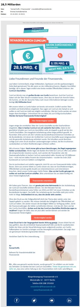 Im Dezember des vergangene Jahres hatten wir zuletzt einen Newsletter von Finanzwende.de weitergeleitet, es ist höchste Zeit, Ihnen die Nachricht zu zeigen, die uns heute erreicht hat. Es geht um CumCum, „den großen Bruder von CumEx“, wie Finanzwende die Vorgänge nennt. Lesen Sie bitte hier zunächst den Newsletter. Wir haben ihn als Foto eingebettet, den Förderlink gibt es deshalb hier extra. Unterhalb des Newsletters kommentieren wir in kurzer Form:
