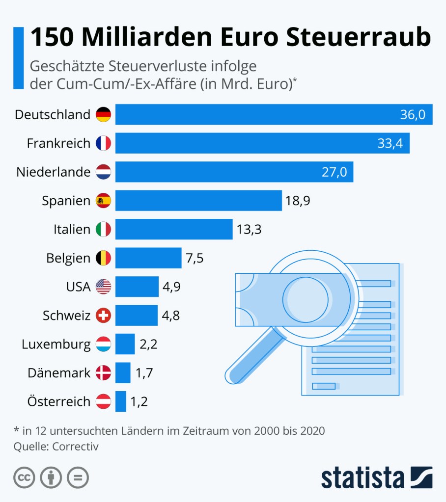 Mindestens 150 Milliarden Euro beträgt der Steuerschaden durch Cum-Cum, Cum-Ex und ähnliche Geschäfte. Das geht aus einer Analyse des Recherchezentrums Correctiv in 12 Ländern zwischen 2000 und 2020 hervor. Die Schätzungen dahingehend waren den Journalist:innen zufolge eher konservativ. Wirtschaftsprofessor Christoph Spengel und sein Team rechnen mit einem Mindestschaden durch Cum-Cum von 141 Milliarden Euro. In den drei von Cum-Ex betroffenen Ländern kommen sie auf eine Summe von mindestens 9,1 Milliarden Euro.