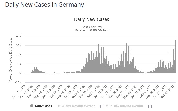 Das kommt wohl von der Gewöhnung. Kino ist kurzfristige Sensation, aber Kriege können ewig währen, ohne dass die Bevölkerung aufsteht und die Soldaten die Waffen niederlegen. Die Menschen machen einfach weiter, obwohl das, was wir aktuell sehen, wahrlich beängstigend ist. Gemäß der folgenden Darstellung war gestern der Tag mit der bisher höchsten Zahl von Neuinfektionen in Deutschland seit Beginn der Pandemie: