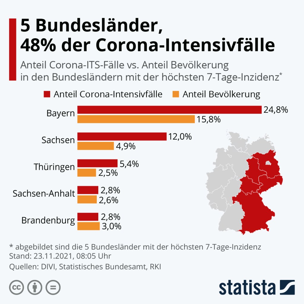 Die fünf Bundesländer mit der höchsten 7-Tage-Inzidenz liegen laut Angaben des Robert Koch-Instituts allesamt im Südosten der Republik. Am höchsten ist sie aktuell mit fast 1.000 in Sachsen. Entsprechend sind dort auch die Intensivstationen besonders voll. Der Freistaat stellt laut Intensivregister zwölf Prozent (Stand: 23.11.2021, 08:05 Uhr) der deutschlandweiten Corona-Intensivfälle – dabei leben dort nur 4,9 Prozent der Bundesbürger:innen. Ähnlich ausgeprägt ist dieses Ungleichgewicht in Bayern, wie der Blick auf die Statista-Grafik zeigt.