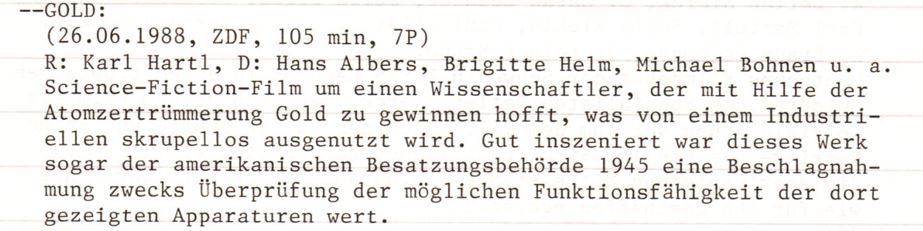 Das große Personenlexikon des Films merkte an: Nachdem der Regisseur bei F.P.1 antwortet nicht „eine sichere Hand für Science-Fiction-Stoffe bewiesen hatte, erhielt Hartl im Spätherbst 1933 die Regie zu „Gold“ angeboten, wieder mit F.P.1-Star Hans Albers in der Hauptrolle. Erzählt wird die dramatische Geschichte um die künstliche Herstellung des Edelmetalles, und wie schon bei „F.P.1“ sind auch in diesem Hartl-Abenteuer einige Finsterlinge, Agenten und Saboteure daran interessiert, dass eine Menschheitsvision scheitert.“[5]