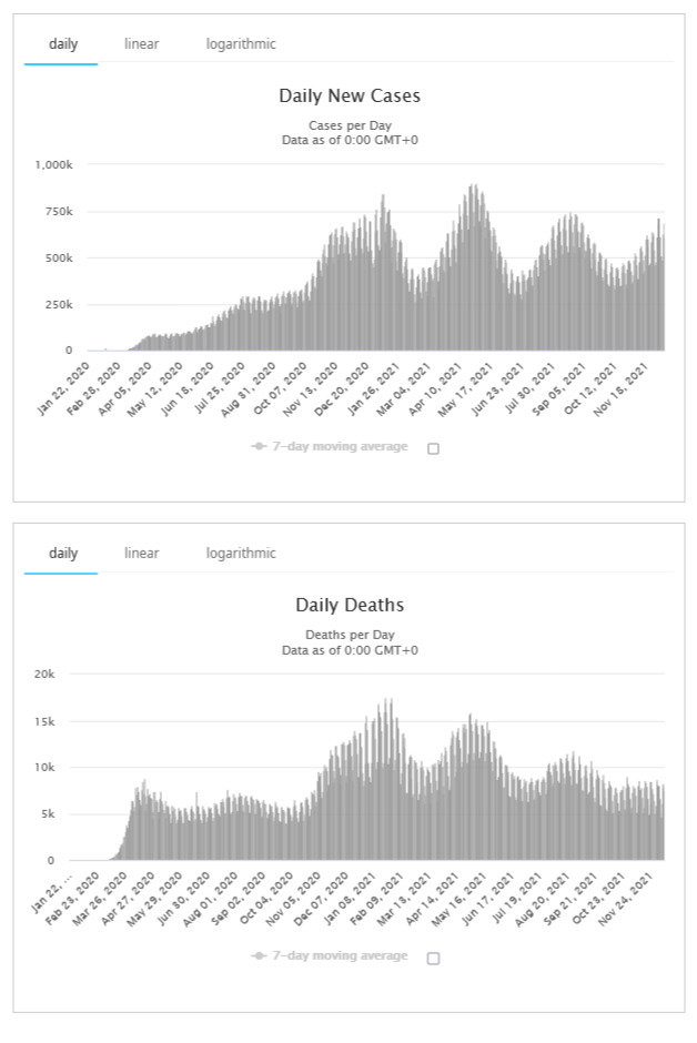 Obwohl vorgestern und gestern erstmals während der vierten Welle die 7-Tage-Inzidenz in Deutschland leicht zurückging (von 456 auf 452 auf 443), stieg sie gestern auf ist RKI-Chef Lothar Wieler überzeugt, dass wir das wirkliche Ausmaß der vierten Welle erst im Frühjahr 2022 werden beurteilen können und warnt vor weiteren Mutationen. Die Empfehlung, sich impfen zu lassen, ist nicht neu, aber immer noch wertvoll. Die Zahl der Todesfälle hatte zunächst vorgestern mit 388 und dann gestern mit 448 jeweils neue Höchstwerte im Rahmen der vierten Welle erreicht.