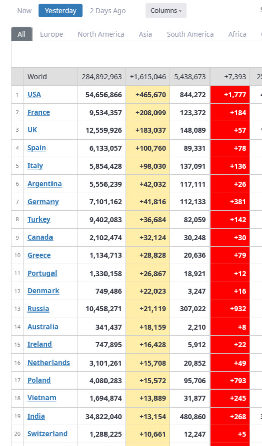 Nebenstehend die Liste der Länder mit den meisten gemeldeten Neuinfektionen, dieses Mal die Top 20, wegen der insgesamt sehr hohen Zahlen: