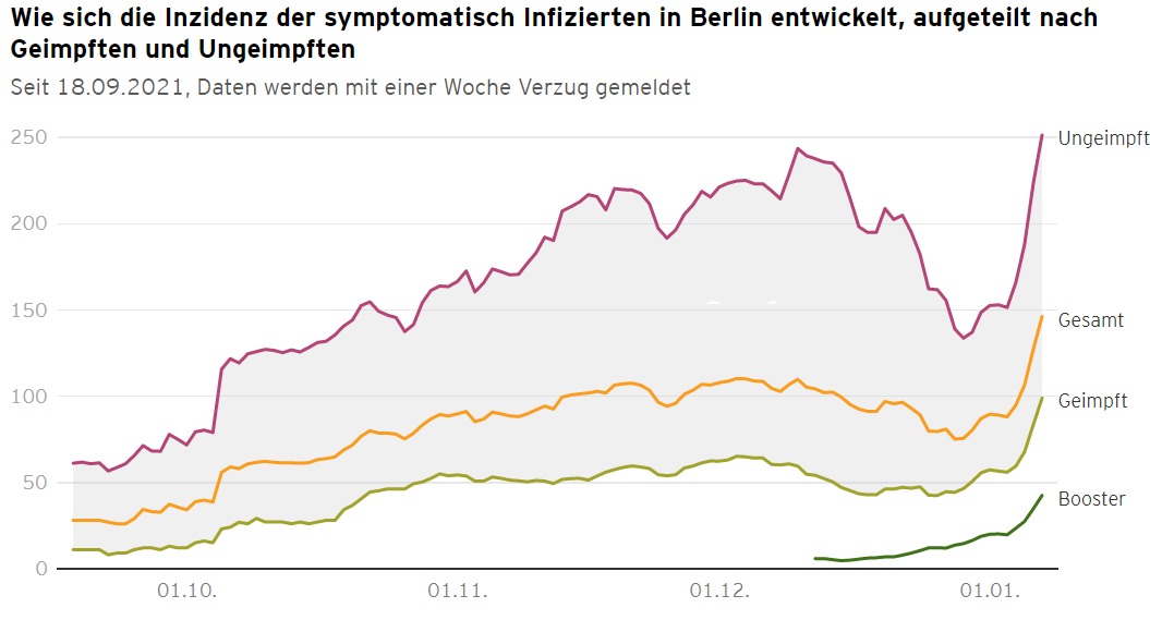 Immerhin, das sind Zahlen, mit denen man etwas anfangen kann. Man könnte sie sogar hochrechnen, wenn wegen Omikron ein weiteres Ansteigen der Infektionswelle zu erwarten ist. Und das ist eben ein entscheidender Punkt: Anders als bei bisherigen Darstellungen, die zu viel Verwirrung gesorgt haben, ist der Impfstatus nach dieser Darstellung bei 90 Prozent der Intensivpatienten bekannt. Die Darstellung stützt auch die dem Thema gewidmete Grafik für Berlin, die wir heute vorgestellt haben.