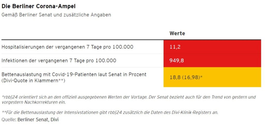 Erstmals stellen wir hier auch die berühmt-berüchtigte Berliner Ampel vor. Nein, Berlin hat keine Ampelkoalition, der Kelch ist nochmal an uns vorübergegangen, aber die „Senatsampel“, die anzeigen soll, wann es Zeit ist, die Corona-Maßnahmen zu verschärfen, die steht bei zwei von drei Kriterien schon seit Tagen auf Rot. Lediglich die Belegung der Berliner Krankenhausbetten mit Covid-19-Patient:innen in Prozent ist noch knapp auf Gelb (bei 20 Prozent schaltet auch sie auf Rot).