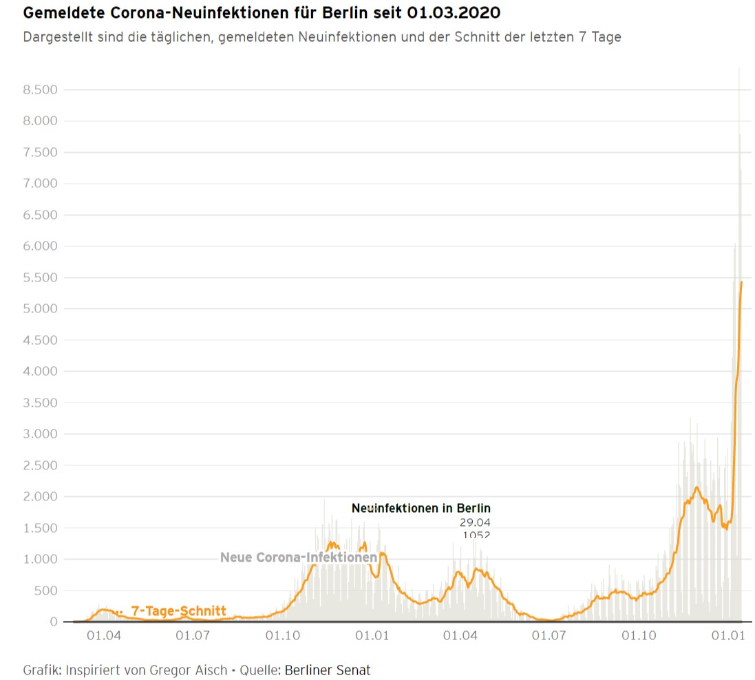 In der vorausgehenden Woche hatte uns der steile Anstieg in der Stadt vollkommen überrumpelt und wir mussten uns auch persönlich darauf einrichten. Dass die Zahlen binnen wenigen Tagen so emporgeschnellt sind, wie die beigefügte Grafik es darstellt, dürfte daran gelegen haben, dass Berlin zu den Bundesländern zählt, die das Erfassen neuer Fälle über die Feiertage hinweg haben etwas lässiger angehen lassen, anders ausgedrückt: Dieser explosionsartige Anstieg dürfte auch auf Nachmeldungen zurückzuführen sein, seitdem steigt die Inzidenz zwar weiter, aber nicht mehr so schnell.[16]