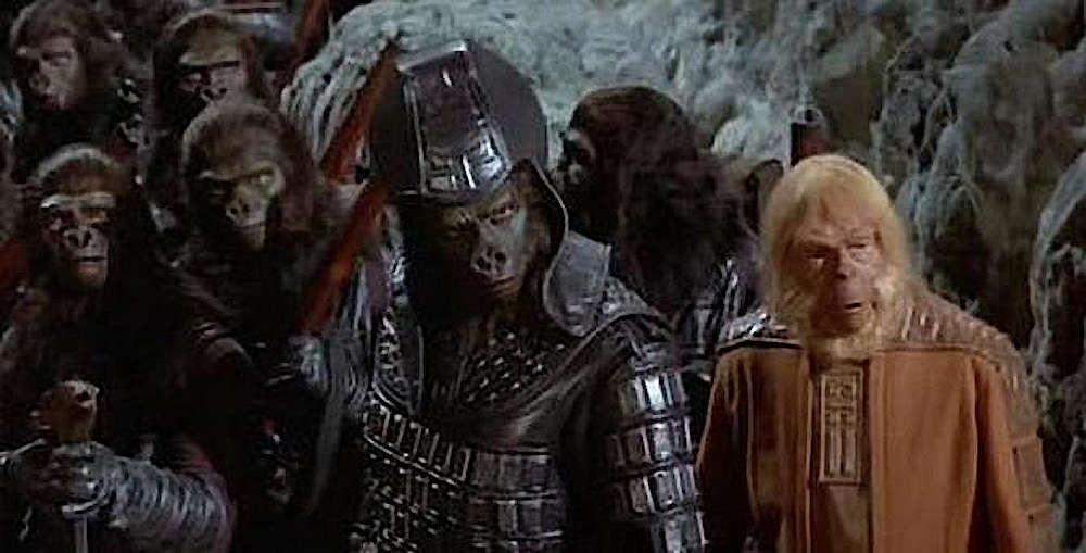 In der Zwischenzeit holt sich General Ursus von den Orang-Utan-Priestern den Segen, um einen Heiligen Krieg gegen die Menschen zu führen. Als die Gorilla-Armee unter General Ursus zusammen mit Professor Zaius loszieht, stellen sich ihnen pazifistische Schimpansen in den Weg und demonstrieren gegen den Krieg. Die Gorillas lassen diese jedoch aus dem Weg räumen und marschieren weiter in Richtung der verbotenen Zone.