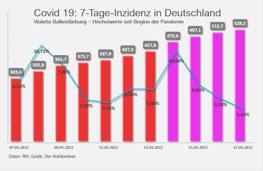 Montag, 17. Januar 2022. Die Anhebung der 7-Tage-Inzidenz in Deutschland setzt sich fort, aber es gibt auch Hoffnungszeichen.