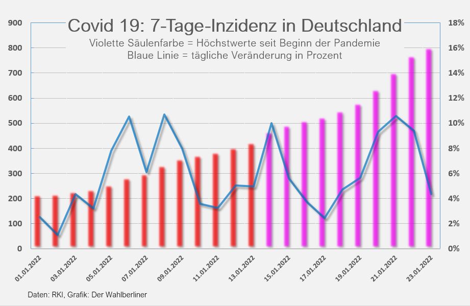 Sonntag, 23. Januar 2022. 85.000 Neuinfektionen wurden gestern gemeldet, die Inzidenz steigt deutschlandweit auf über 800, Hamburg jetzt an der Spitze mit Inzidenz 1.552, keine PCR-Tests mehr für alle.