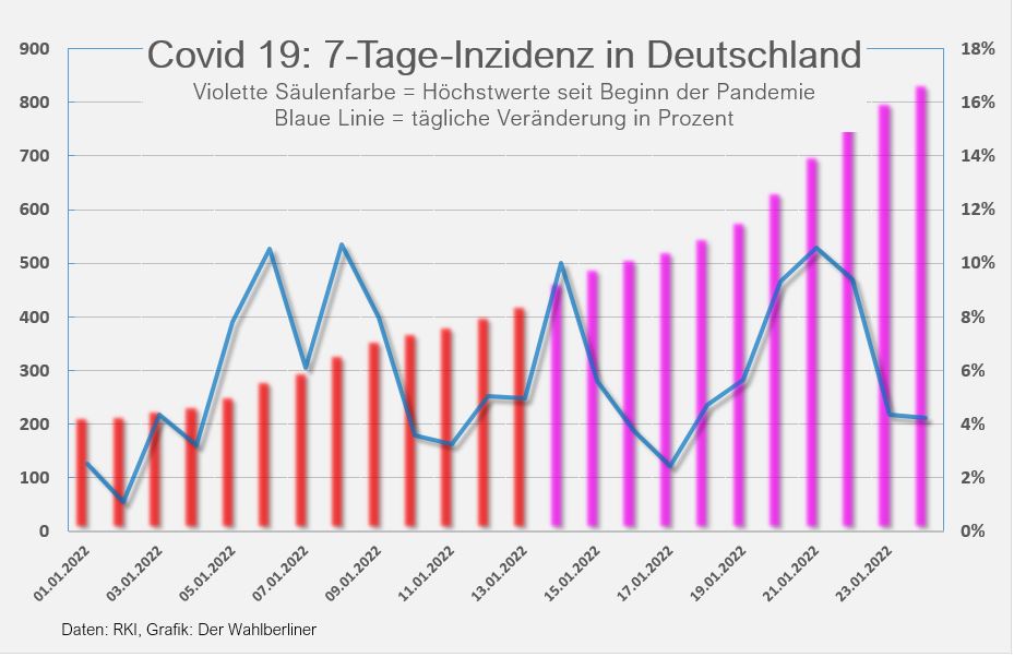 Montag, 24. Januar 2022. Gestern wurden 63.393 Neuinfektionen gemeldet, die Inzidenz liegt deutschlandweit auf 840,3 (gestriger Stand: 806). Damit ist sie seit Anfang Januar ohne Unterbrechung und mittlerweile fast das Vierfache gestiegen, Hamburg liegt seit zwei Tagen an der Spitze, gefolgt von Berlin und Bremen.
