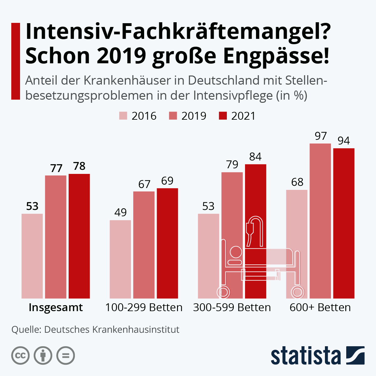 „Stellengesuche ungeimpfter Pflegekräfte führen ins Leere“, titelte der Rundfunk Berlin-Brandenburg (rbb) am vergangenen Wochenende. In dem Artikel ging es darum, dass 100 vermeintliche Stellengesuche von medizinischem Personal in einem Bautzener Anzeigenblatt sich – zumindest teilweise – als Fake entpuppten. Das heißt nicht, dass es sowas wie eine Personalflucht aktuell gar nicht gibt, aber bewiesen ist sie derzeit nicht. Gesichert ist dagegen der Fachkräftemangel bei Pflegepersonal, beispielsweise auf Intensivstationen. Im vergangenen Jahr klagten laut Krankenhaus-Barometer 78 Prozent der Krankenhäuser in Deutschland über Stellenbesetzungsproblemen in der Intensivpflege. Wie der Blick auf die Statista-Grafik zeigt, ist das Problem bei Kliniken mit 600 oder mehr Betten m größten. „Im Mittel bleiben unbesetzte Stellen in der Intensivpflege derzeit für 21 Wochen“, so die Studie. Das Personalproblem in der Intensivpflege gibt es übrigens nicht erst seit Corona – schon 2019 gab es große Engpässe.