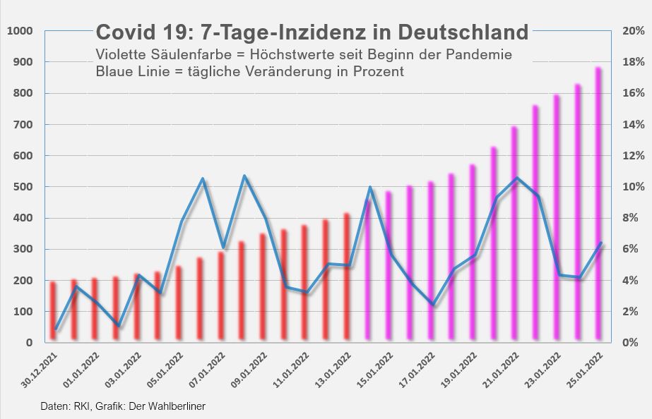 Dienstag, 24. Januar 2022. Gestern wurden 126.955 Neuinfektionen gemeldet, das sind mehr als doppelt so viele wie vorgestern (63.393) und ca. 50.000 mehr als vor einer Woche. Die Inzidenz stieg deutschlandweit auf 894,4 (Vortag: 840,6). Insofern nicht viel Neues innerhalb der Steigerungsrallye und wir erwarten für morgen einen neuen Höchststand bei den Neuinfektionen sowie eine neue Rekordinzidenz, die möglicherweise an 1.000 heranreicht.