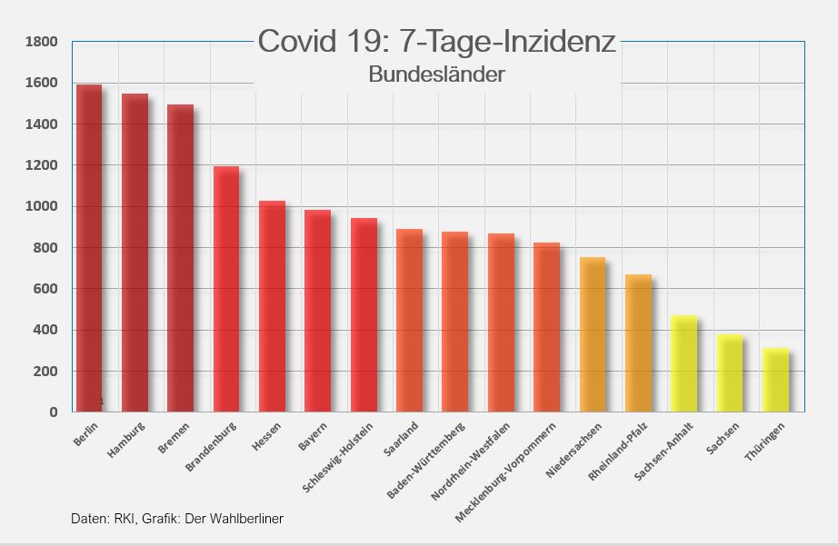 Die ersten fünf Plätze hält immer noch Berlin, aber wir haben das Tableau heute auf die neun am meisten betroffenen Stadt- und Landkreise erweitert, alle weisen eine Inzidenz von mehr als 1.700 auf. Auf Rang acht nun auch sichtbar: Unser Wohnbezirk in Berlin, dessen Zahlen in den letzten Tagen massiv in die Höhe geschnellt sind.