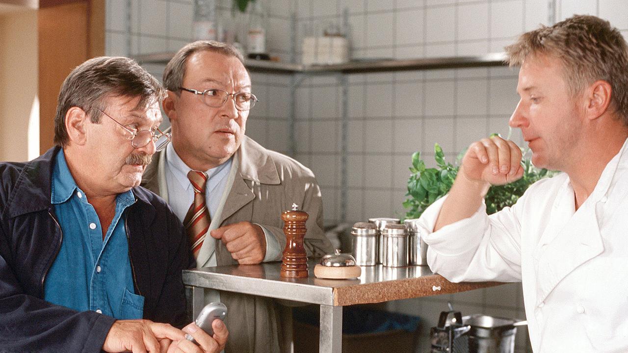 Es ist nichts vollkommen anderes, wenn ich zunächst über eine Beobachtung ein paart Takte loswerden muss, die es bei Schmücke und Schneider zu allen Zeiten gab. Leider eignet sich ein Feinschmecker-Restaurant besonders gut dazu und der Versuchung ist man denn auch komplett erlegen. Nämlich Schmücke und Schneider als den Bonvivant und den Spießer einander gegenüberzustellen. Armer Wolfgang Winkler, ich hoffe, er hat nicht zu sehr leiden müssen. Aber ganz langsam komme ich dahinter, dass die beiden etwas ziemlich Perfides abziehen. Schmücke spielt im Grunde einen snobistischen Wessi und Schneider den biederen Ossi. Dadurch jedoch, dass beide aus dem Osten kommen, akzeptiert das Publikum Schmückes Manierismen und identifiziert sich gleichzeitig mit Schneider. Nicht weniger als 50 Fälle lang hat dieses Muster funktioniert und die beiden vermutlich jenseits der früheren Zonengrenze beliebter gemacht als etwas das Tatort-Duo Ehrlicher und Kain, obwohl vor allem Ersterer wirklich die Klaviatur des Nachwende-Leids wie kaum eine andere Fernsehfigur beherrschte. Schmücke und Schneider wirken viel lockerer und sind auf ihre Weise vielleicht viel hintergründiger.