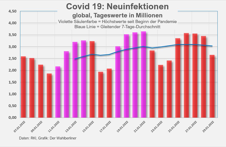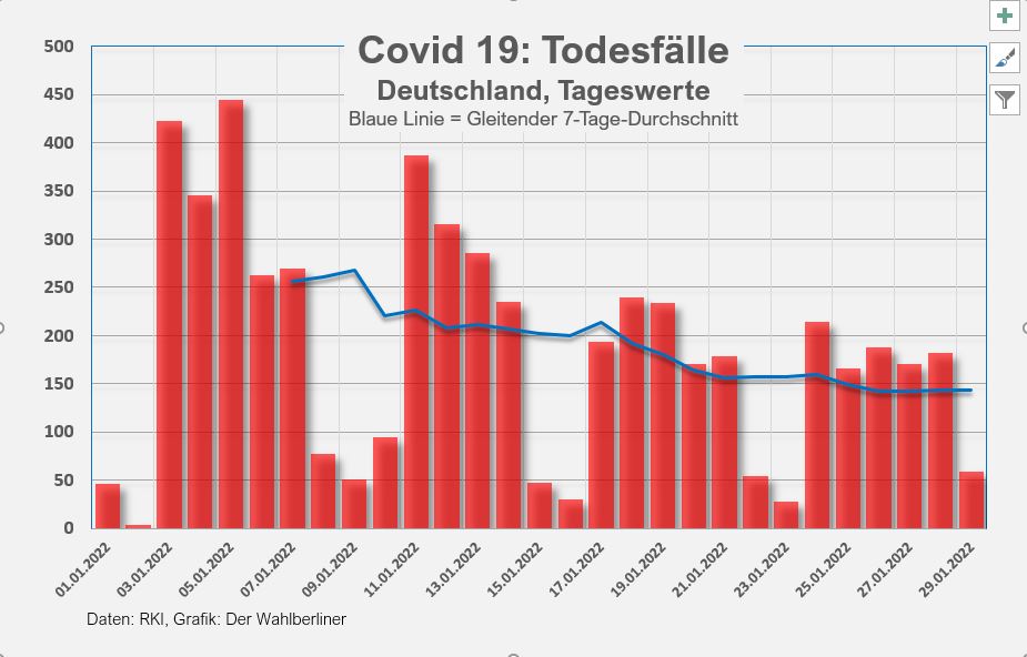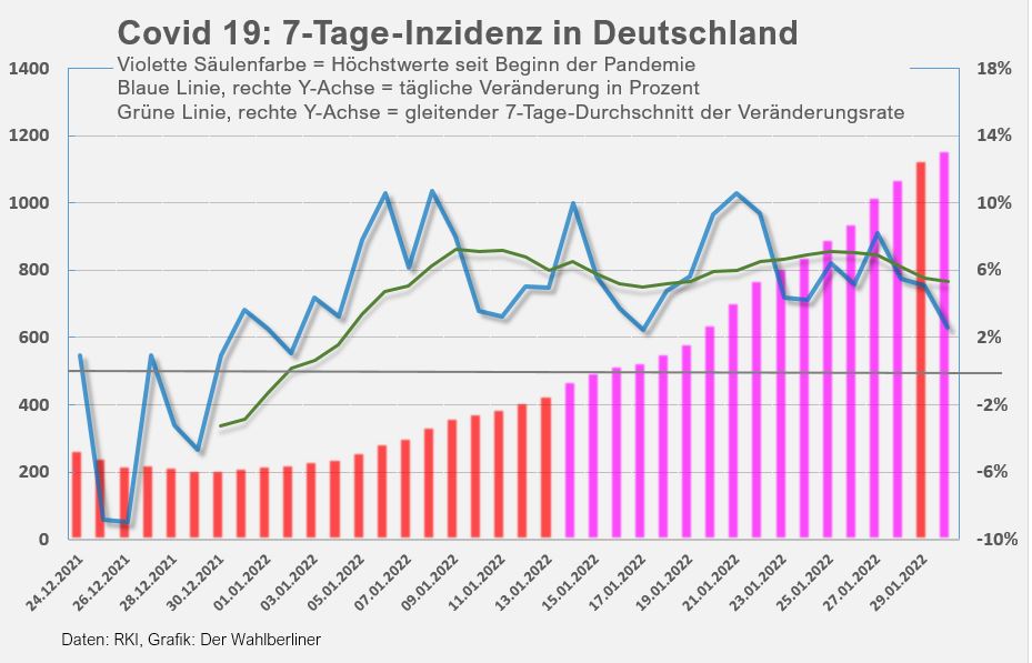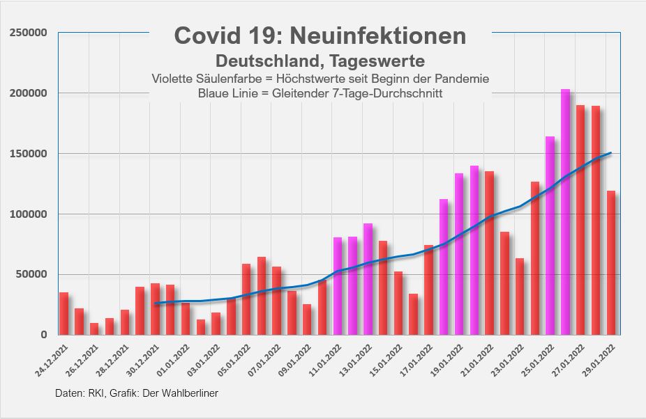 Sonntag, 30. Januar 2022. Die Inzidenz in Deutschland erreicht mit 1156,8 ein weiteres Allzeithoch (gestern 1127, vorgestern 1073), die gemeldeten Neuinfektionen sinken von 189.000 auf 119.000 (gegenüber 85.000 am vergangenen Sonntag). Am dritten Tag in Folge weist unser Wohnbezirk in Berlin die höchste Inzidenz deutschlandweit auf.