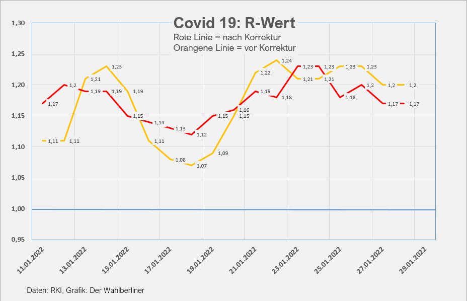 Werte von mehr als 1,10 gelten bereits als sehr kritisch, diese Marke wird überschritten, seit wir den R-Wert erfassen. „Wir hätten gerne als weiteres Hoffnungszeichen einen sinkenden R-Wert verkündet, aber er bleibt vorerst auf hohem Niveau, mit Werten um 1,2 nach der üblichen Korrektur am Folgetag. Wir haben einen Tag aus der Grafik entfernt (den 29.01.) weil uns soeben aufgefallen ist, dass die zuletzt identischen Zahlen darauf beruhen, dass am 28.01. zuletzt erfasst wurde.