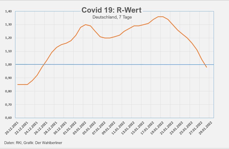 Wir haben die R-Wert-Grafik am 31.01.2022 komplett neu aufgesetzt und entnehmen die Datensätze seitdem der Originalquelle, der entsprechenden Tabelle des RKI.[20] In der Tat zeigt sich auch hier seit Tagen ein deutlicher Rückgang.