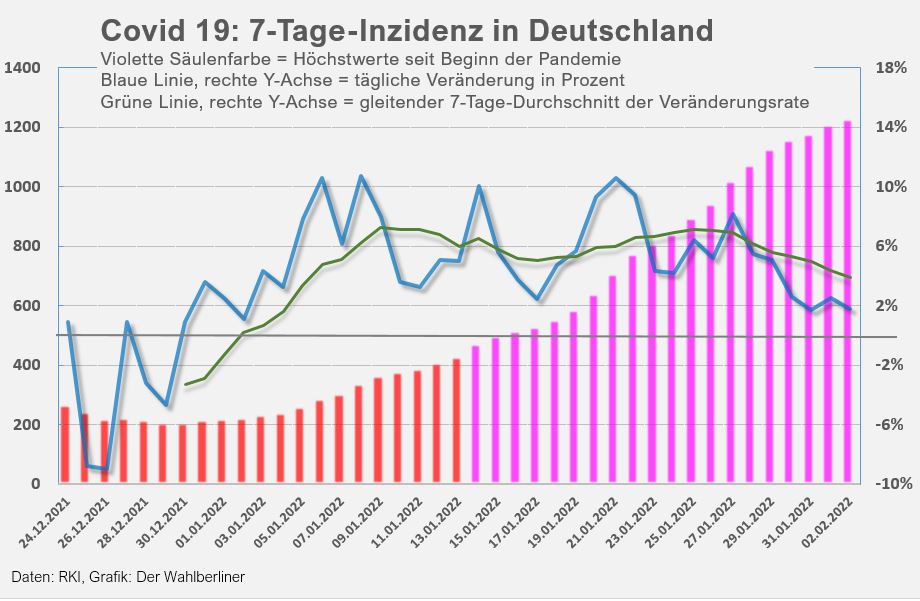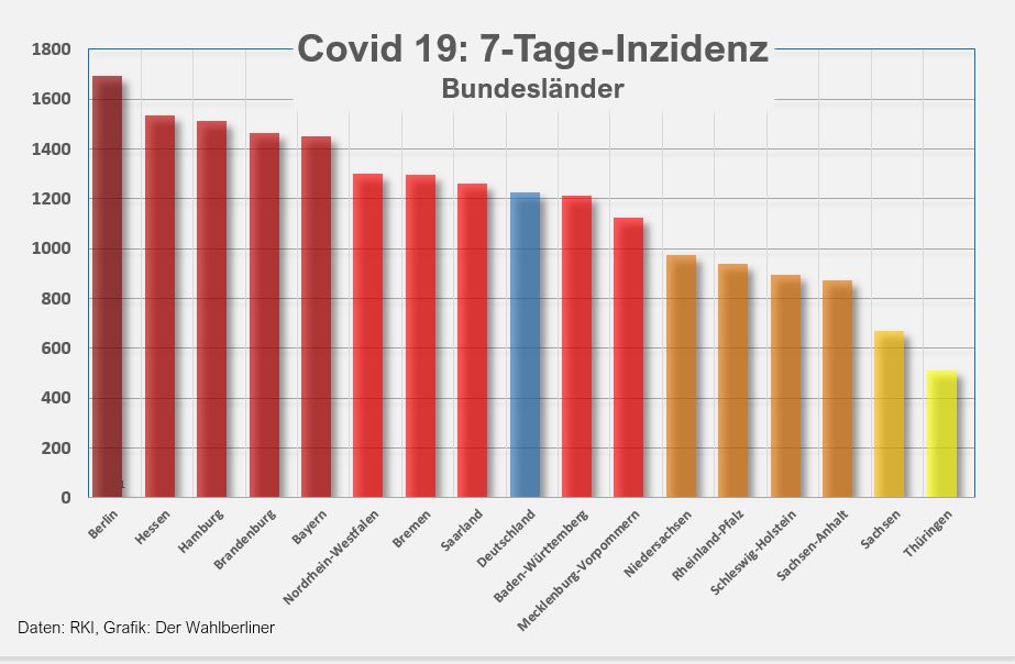 Ein Hoffnungszeichen: Die Inzidenz in den Stadtstaaten, die bisher von der Omikron-Welle deutlich am stärksten betroffen und deren Vorreiter waren, sinkt weiterhin ab. Berlin ist zwar immer noch Nr. 1, aber mit einer Inzidenz von jetzt weniger als 1.700. Es ergibt einen Unterschied, ob diese Bundesländer generell höhere Inzidenzen aufweisen, weil man sich in Großstädten leichter anstecken kann, oder ob ihre Entwicklung ein Zeichen dafür ist, dass der Höhepunkt der Omikron-Welle dort, wo sie in Deutschland begann, möglicherweise überschritten ist.
