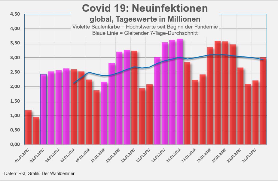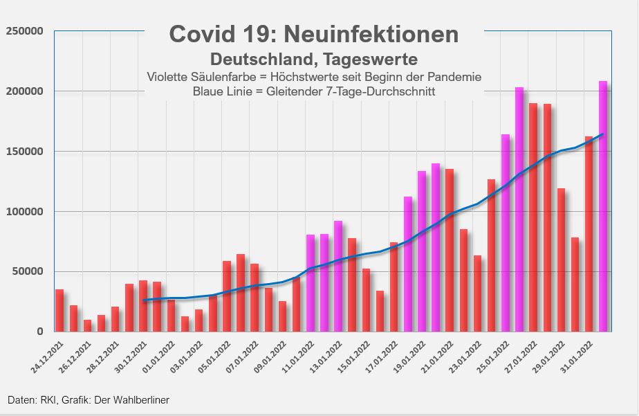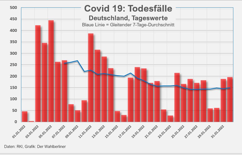 Was wir am 01.02. festgestellt haben: Die R-Werte für einzelne Tage erfahren noch 14 Tage nach ihrer erstmaligen Publikation Änderungen. Das macht die Erfassung recht mühsam, auch der gestrige R-Wert wurde heute um 0,04 Punkte angehoben. Erstmals zeigt heute seit dem Beginn der Omikron-Welle der (vorläufige) R-Wert eine Zahl von weniger als 1,0. Das Infektionsgeschehen spiegelt dies in Form zurückgehender Inzidenzwert-Steigerungen, aber noch nicht sehr deutlich in Fallzahlen, außerdem ist die Datenlage nicht sicher. Unter diesen Umständen ist auch ein R-Wert von weniger als 1,0 kein Grund, die Sektkorken knallen zu lassen oder etwa Lockerungen zu fordern, wie es der bayerische Ministerpräsident penetrant tut, obwohl gerade in seinem Bundesland keinerlei Entspannung zu registrieren ist.