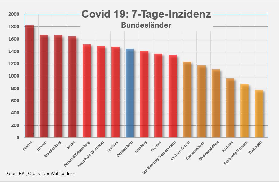 Aktuell liegen 42 Kommunen bei einem Inzidenzwert von mehr als 2.000, an den vorausgehenden Tagen waren es 36 / 34 / 37 / 26 / 18. Obwohl Berlin immer noch die vierthöchste Inzidenz aller Bundesländer ausweist, findet sich unter den Hochinzidenzkommunen nur noch eine aus Berlin. Der bayerische Kreis Fürstenfeldbruck hatte gestern mit 4.083 die höchste je in Deutschland gemessene Corona-Inzidenz, heute ist ein leichter Rückgang zu verzeichnen.