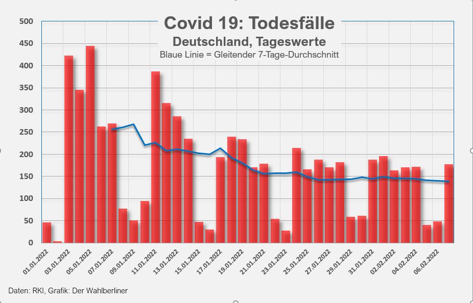 Die Wochentendenz bei den Todeszahlen an / mit Corona in Deutschland ist leicht abwärts gerichtet,[12] der Tagesdurchschnitt liegt nun bei ca. 140 Meldungen in den letzten sieben Tagen.