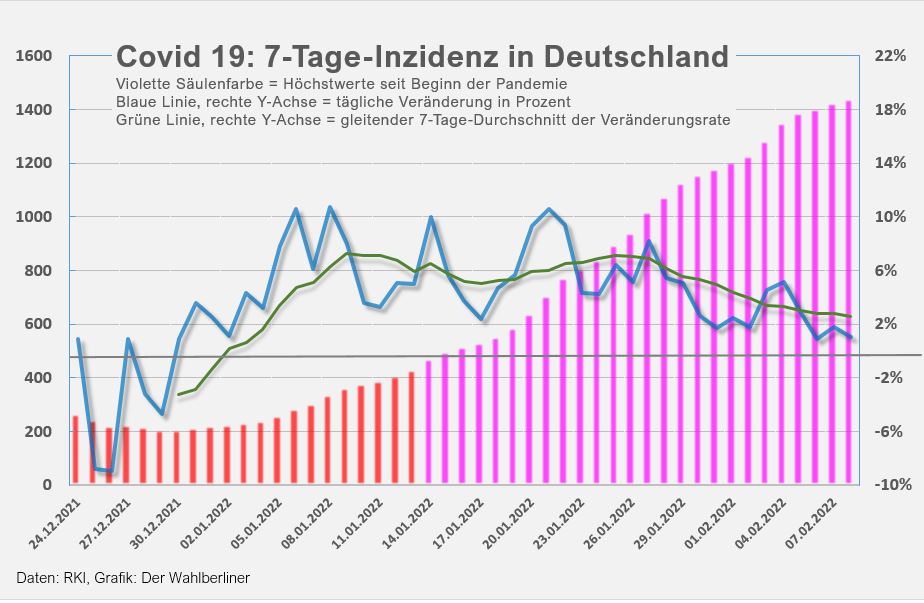 Die Inzidenz in Deutschland steigt auf hohem Niveau weiterhin an, prozentual aber nicht mehr so stark wie vor wenigen Wochen. Der durchschnittliche Anstieg innerhalb der letzten sieben Tage liegt nur noch bei etwas mehr als 2 Prozent.