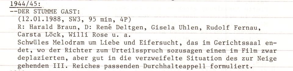 Durchschnittlich würde bei uns eine Wertung von etwa 6/10 bedeuten, offenbar hat mir vor allem das Ende nicht gefallen. Vielleicht, weil es zu dicht am Ende des benannten Dritten Reiches war. Ich habe beim Anschauen oft das Gefühl, ich rieche Brand und sehe Trümmerberge und leere Fensterhöhlen, auch wenn Filme derlei gar nicht zeigen. Es gibt allerdings auch einige „Überläufer“, die erst nach dem 8. Mai 1945 fertiggestellt wurden, unter anderem bei der DEFA. Jedenfalls weiß ich jetzt, wo die Idee zu dem Tatort-Titel „Der stille Gast“ zu finden ist. Allerdings handelt es sich in diesem Plot nicht um ein Eifersuchtsdrama, sondern um einen Serientäter.