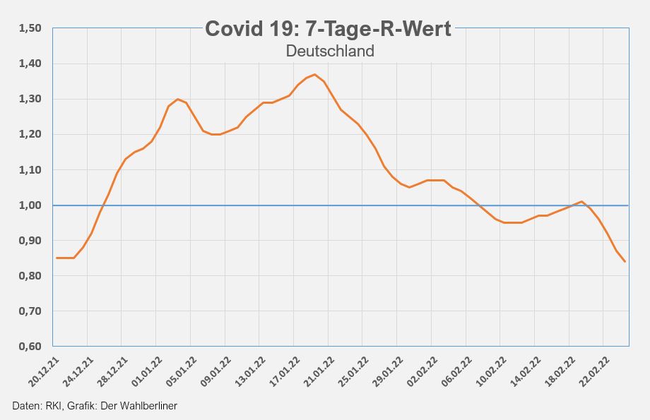 Interessant ist, auch unter Berücksichtigung der Tatsache, dass er immer fünf Tage „nachhinkt“, die Entwicklung des R-Wertes. Die vorläufigen 0,84, die das RKI heute für den 25.02. ausweist, sind der niedrigste Wert seit dem Beginn der Omikron-Welle. Im Rückgang der Inzidenz hat sich das vor einigen Tagen so deutlich nicht ausgedrückt. Wir wagen die Prognose, dass der R-Wert der letzten 14 Tage, in denen er einen deutlichen Knick erfuhr, etwas nach oben angepasst werden wird. Weil er auch heute wieder von allen wichtigen Werten die stärkste Bewegung zeigt, bilden wir ihn wieder ab.