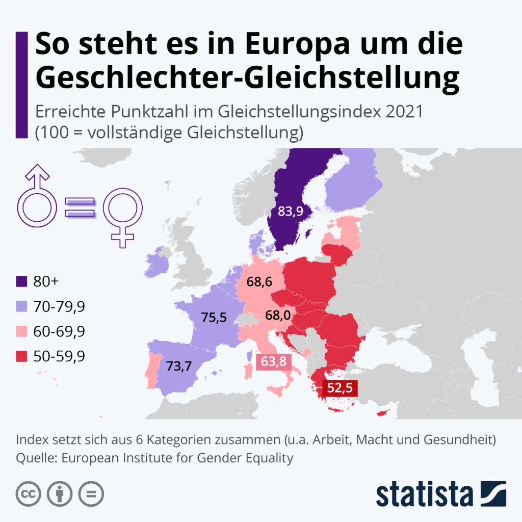 nachdem wir gestern den Equal Pay Day thematisiert haben, schauen wir heute auf die allgemeine Gleichstellung in der EU und zeigen wieder eine Statista-Grafik zum Thema. Wir kommentieren auch, aber nur kurz und erklären auch, warum wir uns dabei kurz fassen: