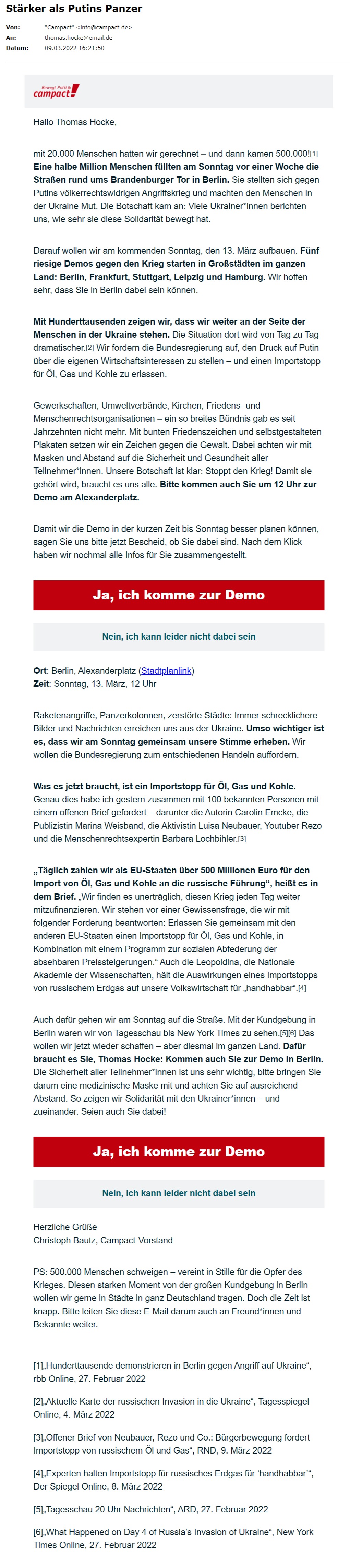 auch wir waren sehr beeindruckt davon, wie viele Berliner:innen vor knapp zwei Wochen auf der Straße waren, um gegen Wladimir Putins Angriffskrieg auf die Ukraine zu demonstrieren. Können wir das am kommenden Sonntag, dem 13. März, wiederholen? Wir posten hier den Aufruf von Campact.